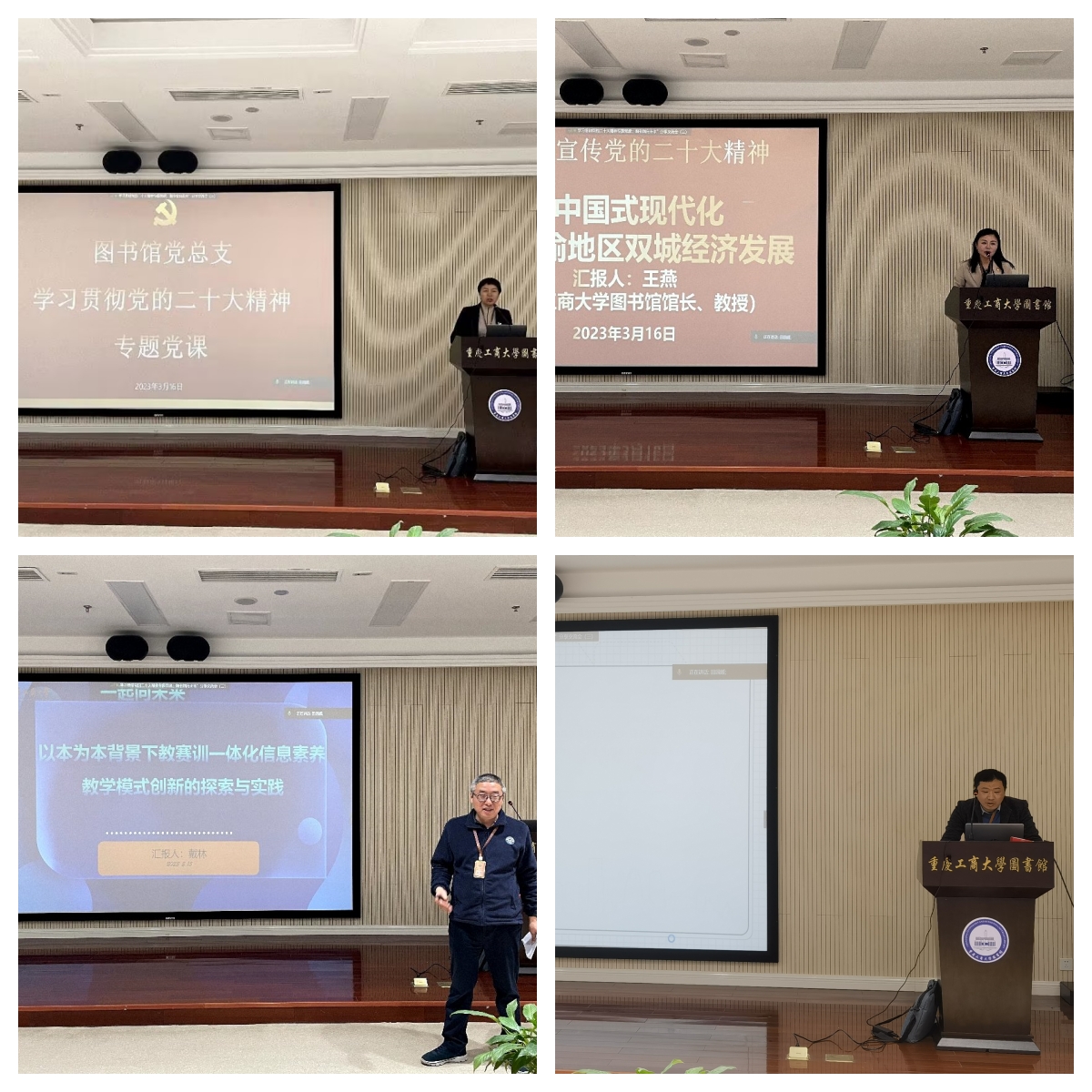 会议第一阶段为“学习贯彻二十大精神专题党课”,由图书馆馆长王燕作主题报告《中国式现代化与成渝地区双城经济发展》。王燕从“二十大精神”解读、“中国式现代化”的内涵、特征及展望、当前国际国内经济发展形势与挑战以及成渝地区双城经济圈的发展与思考等方面,讲解了中国式现代化的宏伟蓝图以及如何立足本职工作把二十大精神落实到实处,为学校发展以及推动成渝地区双城经济圈发展作出自己的贡献。
