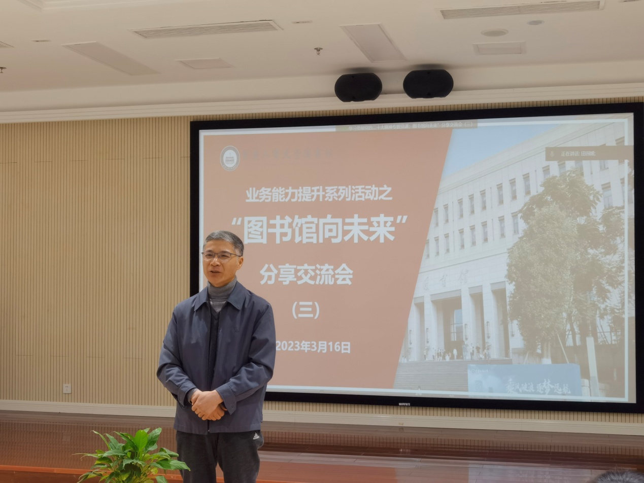 会议第二阶段为“图书馆向未来”分享交流会,图书馆副馆长戴林、信息化建设部王文明博士分别作《以本为本背景下教赛训一体化信息素养教学模式创新的探索与实践》和《文献开放获取研究进展》的分享交流。